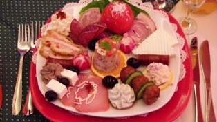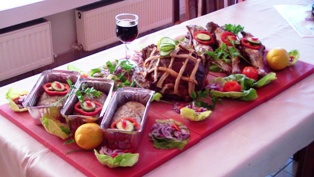 O gustare de bun venit si cu bauturi (palinca, afinata, vinul casei)